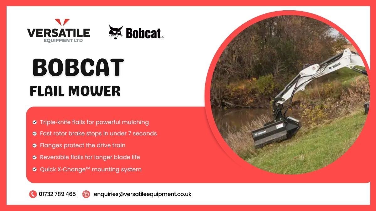 Visit the official page as well to learn more about the Bobcat Flail Mower. Once you are ready, get in touch to hire or purchase, as we are Bobcat authorised dealers in Kent, Essex, London, Suffolk, Norfolk, Cambridgeshire, Northamptonshire, and Bedfordshire.
